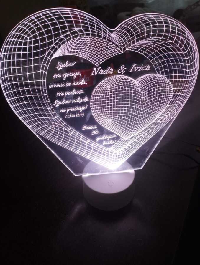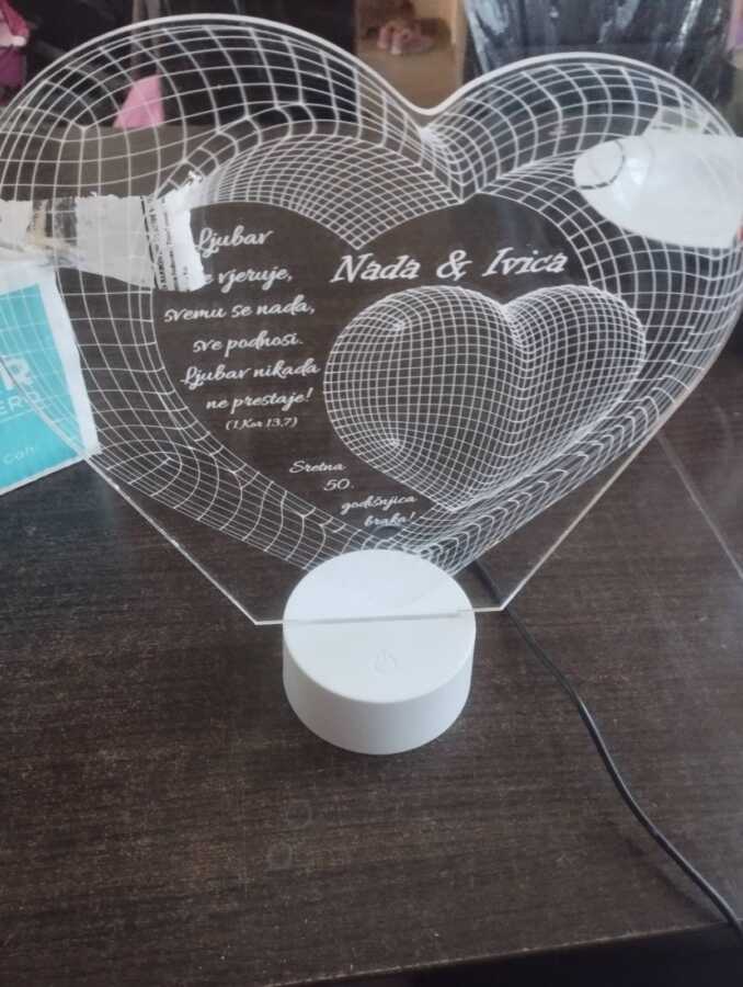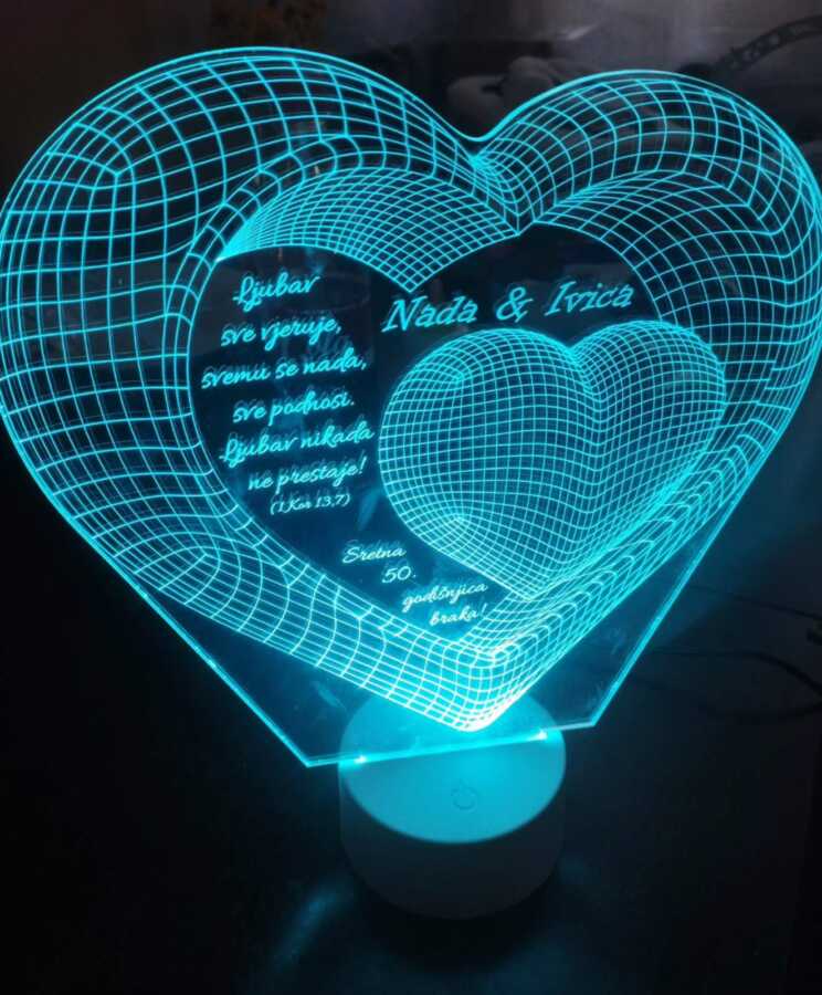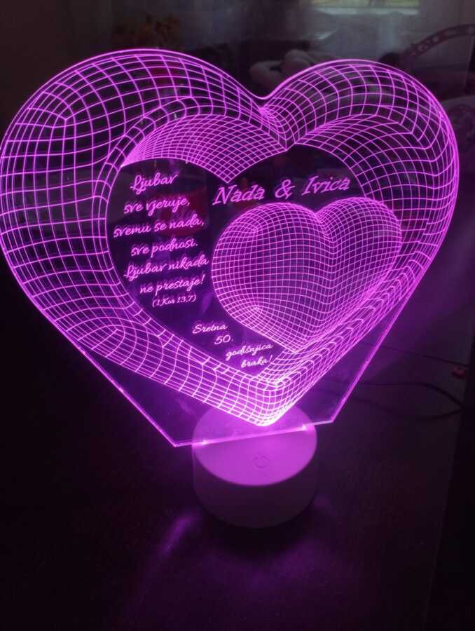 Lampa približnih dimenzija 20×25 cm, mijenja boje. Moguća personalizacija s imenima ili tekstom.