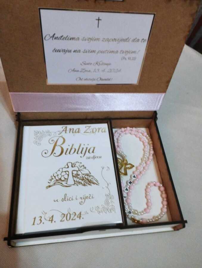 Za personalizaciju upišite ime djeteta i datum krštenja te odaberite boju trake i mašne.