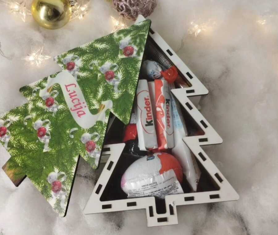 Poklon kutija u obliku bora, snjegovića ili kinder jaja, dimenzija 20×17 cm. Može doći puna slatkiša ili prazna.
