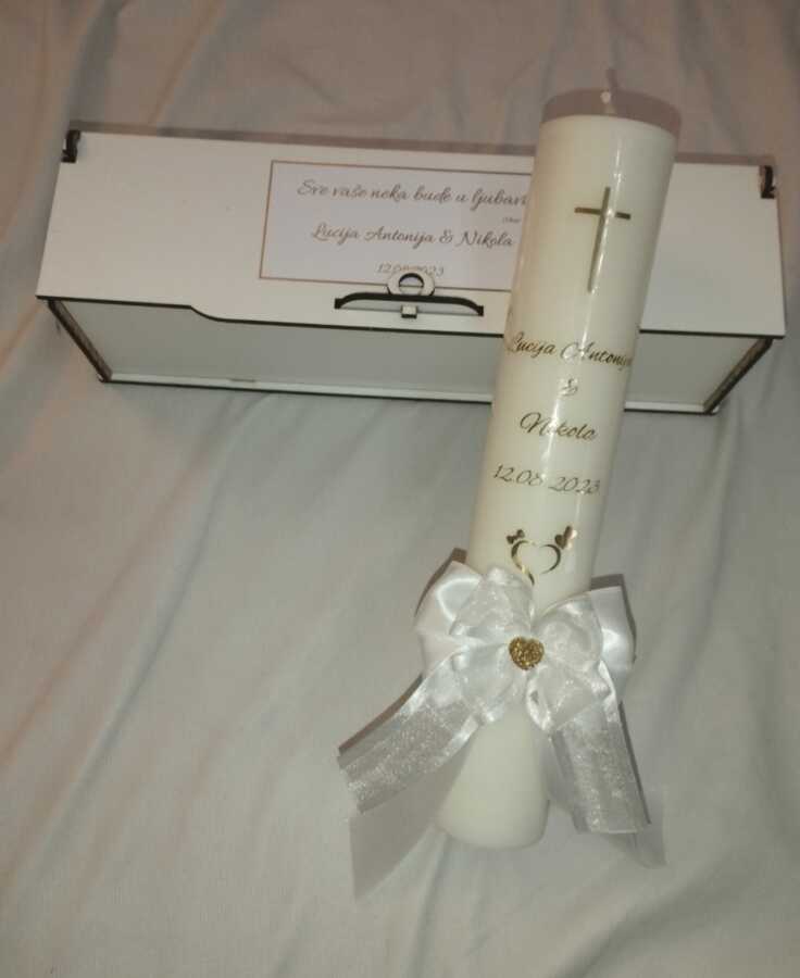 Svijeća dimenzija 5×28 cm dolazi u drvenoj kutiji.