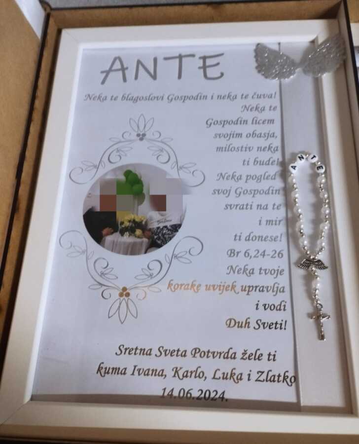 Paket sadrži: okvir, krunicu, čokoladice i prazan prostor za kuvertu. Okvir može biti sa simbolom ili slikom krizmanika.