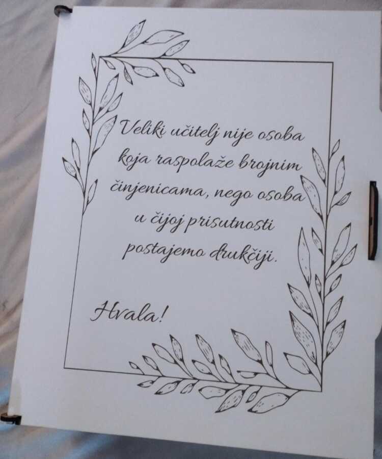 Kutija za uspomene za učitelja s posvetom. Dimenzije: 20×30 cm.